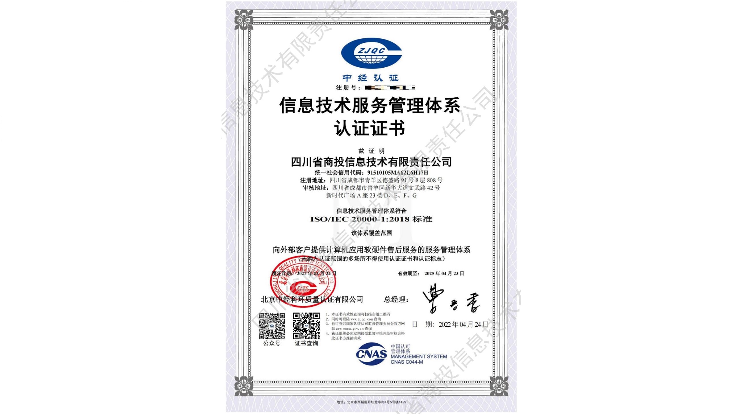 ISO20000信息技术服务管理体系认证证书
