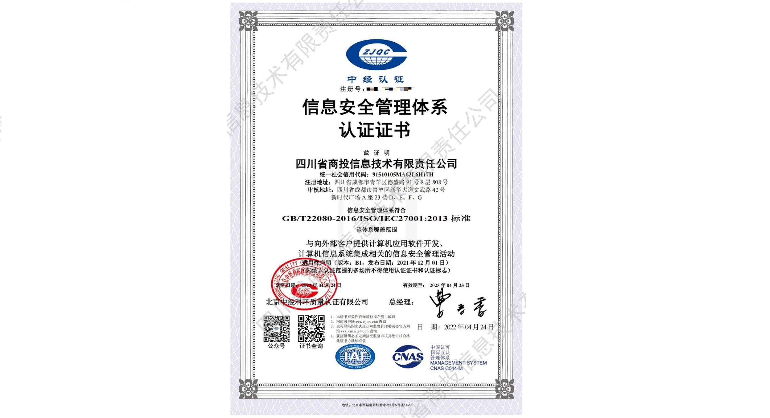 ISO27001信息安全管理体系认证证书