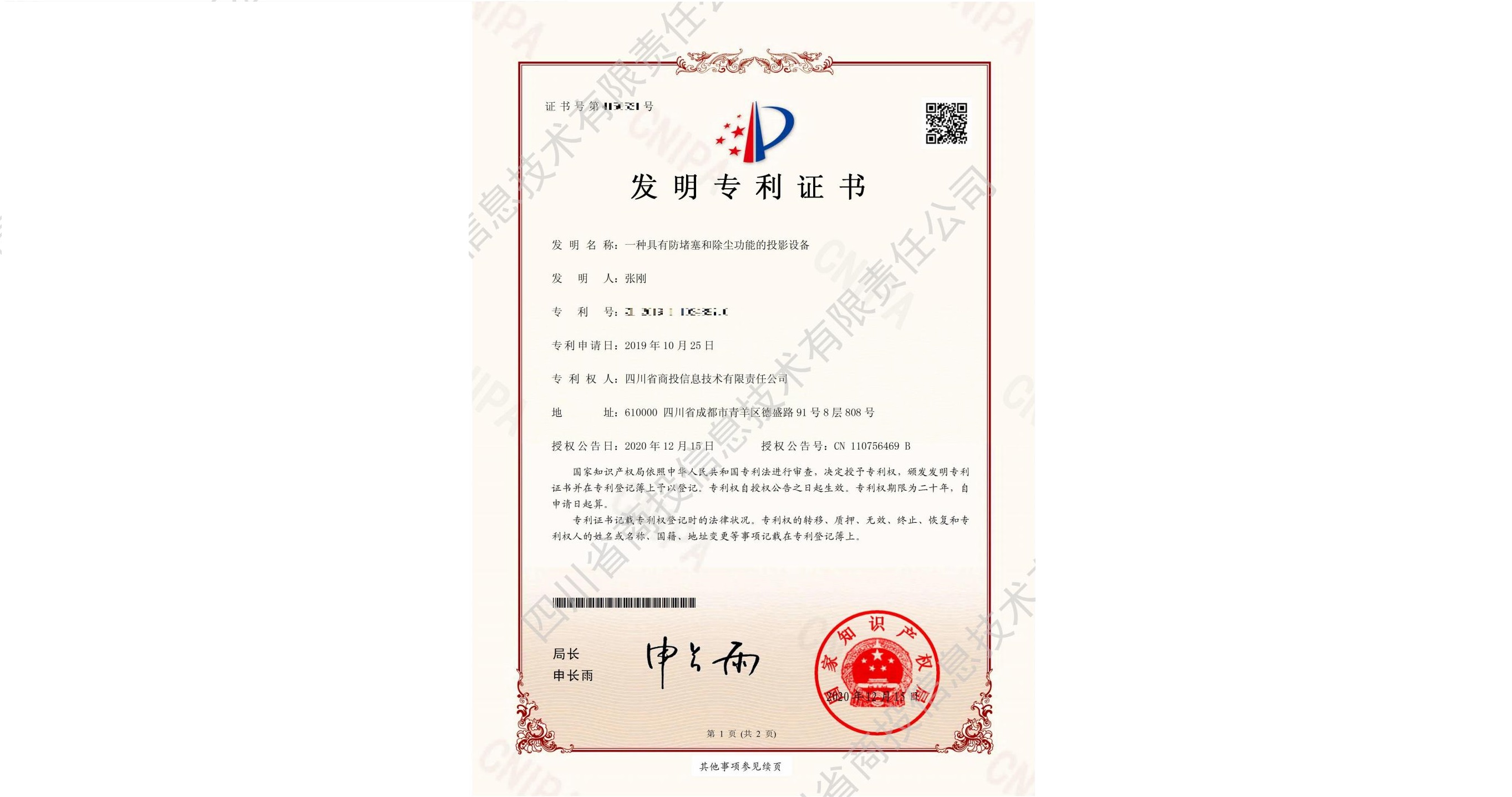 一种具有防堵塞和除尘功能的投影设备-发明专利证书