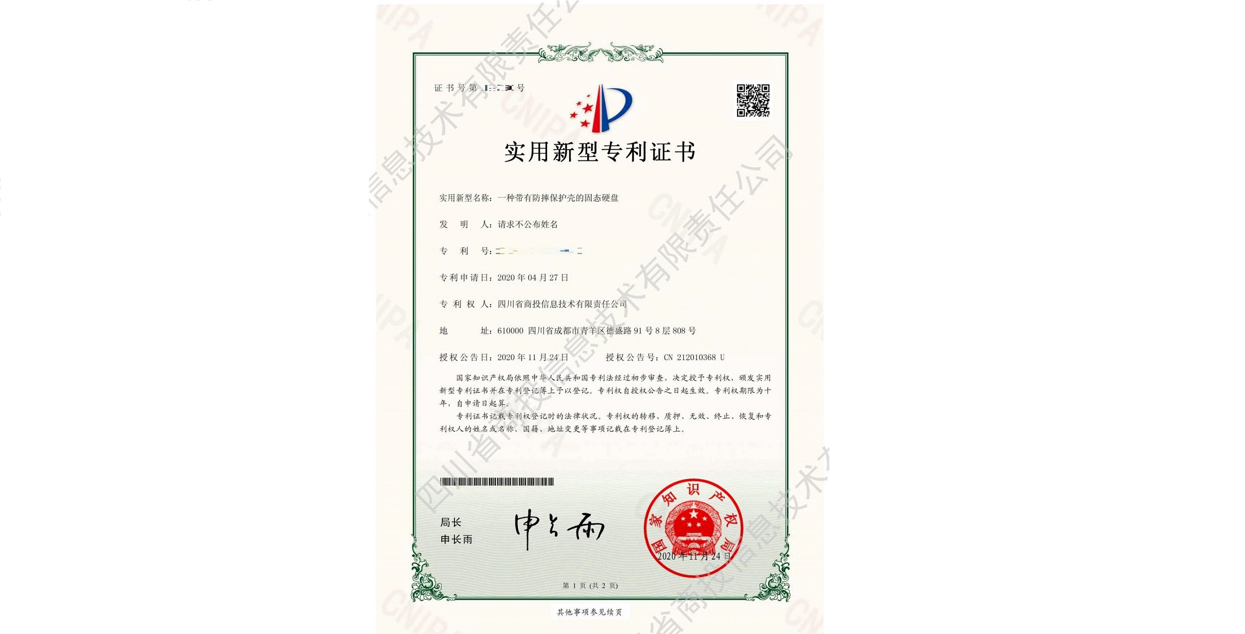一种带有防摔保护壳的固态硬盘-实用新型专利证书