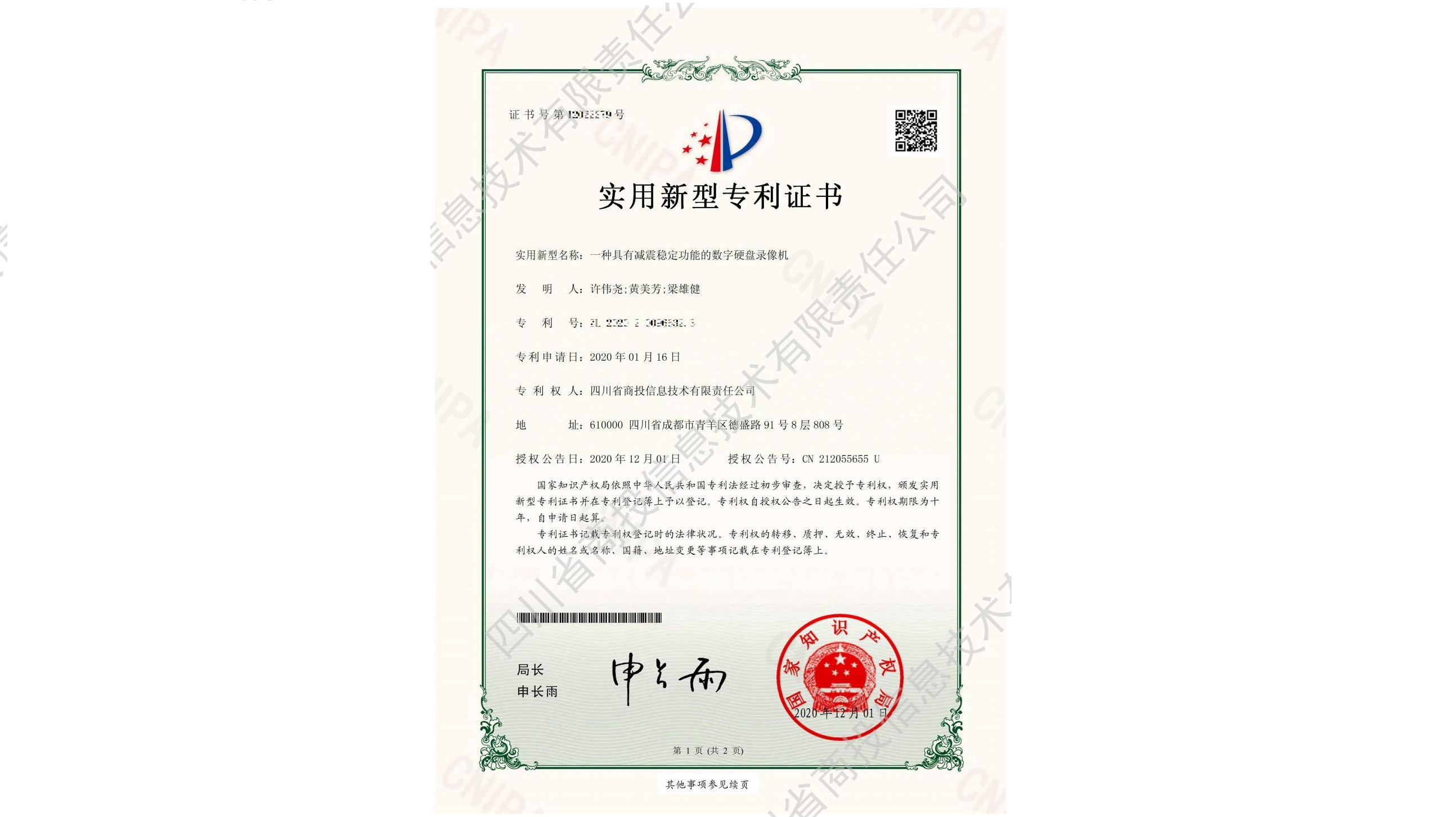 一种具有减震稳定功能的数字硬盘录像机-实用新型专利证书