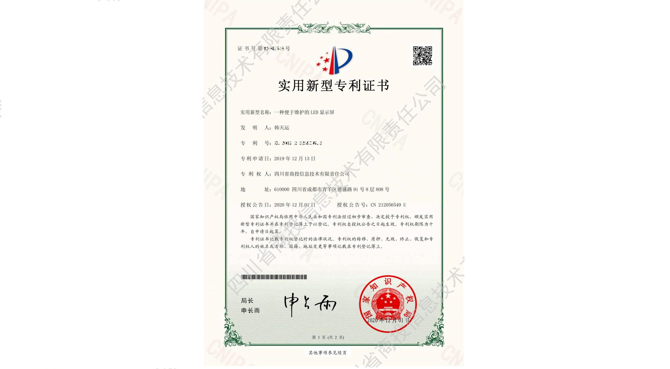 一种便于维护的LED显示屏-实用新型专利证书