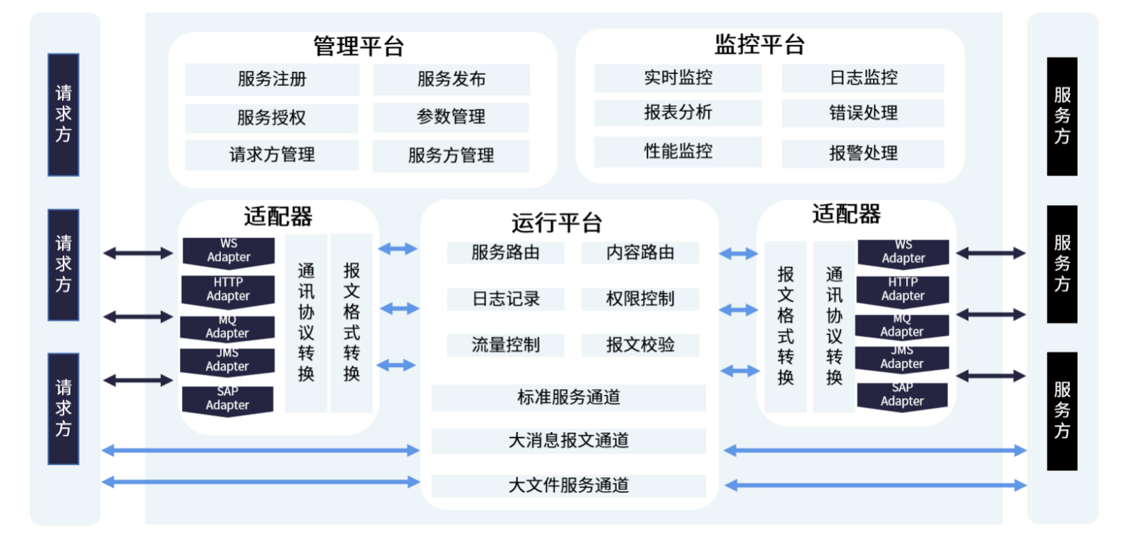 企业服务总线ESB通过报文转换、消息路由、协议适配、服务编排、服务监管、服务门户、服务展示平台等实现应用系统间的安全高效互联互通