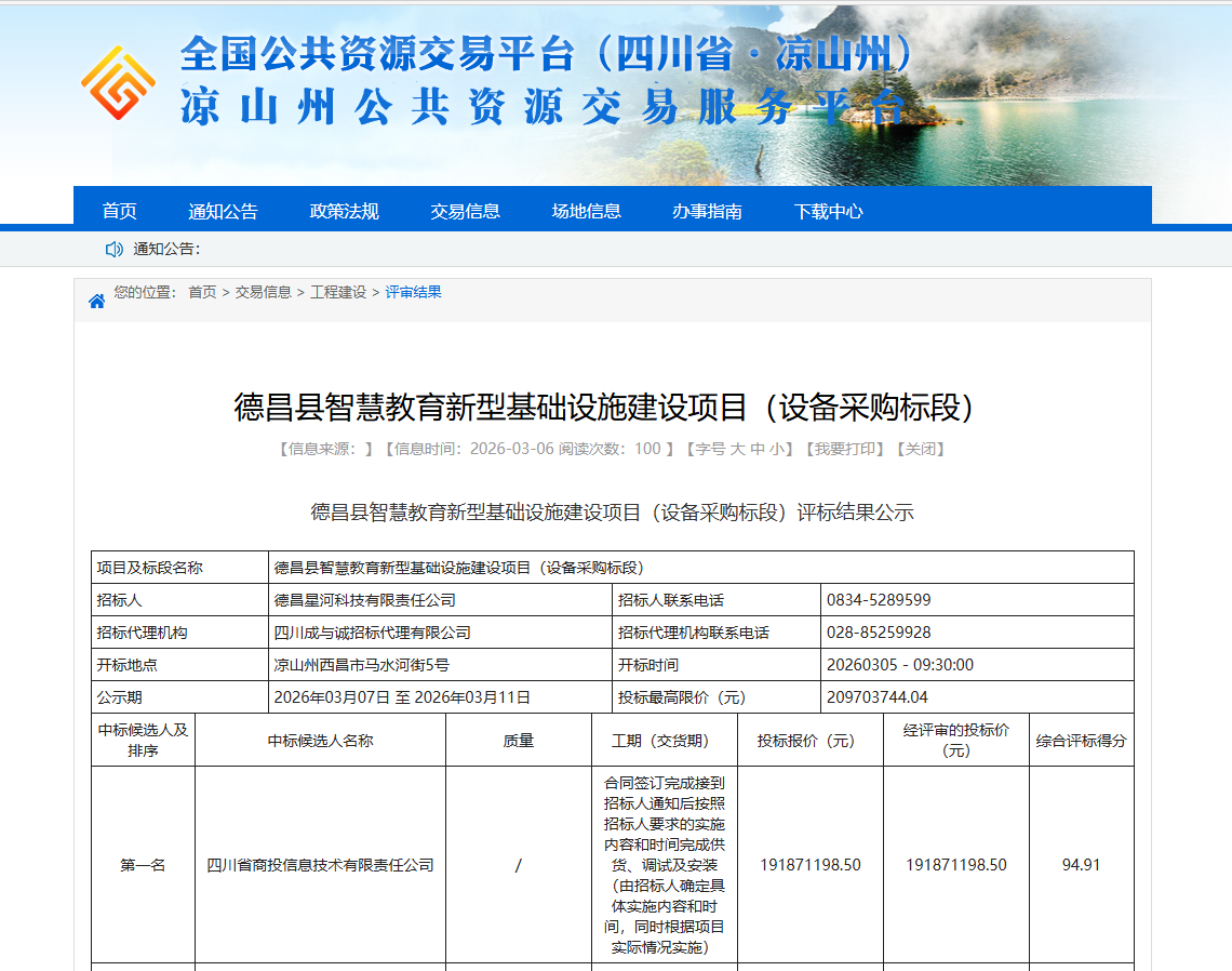 近日,从凉山彝族自治州德昌县公共资源交易中心传来捷报,商投信息公司成功中标《德昌县智慧教育新型基础设施建设项目(设备采购标段)》,中标金额达1.9187亿元,为公司2026年经营业绩赢得“开门红”,也为“十五五”开局之年高质量发展奠定了坚实基础。