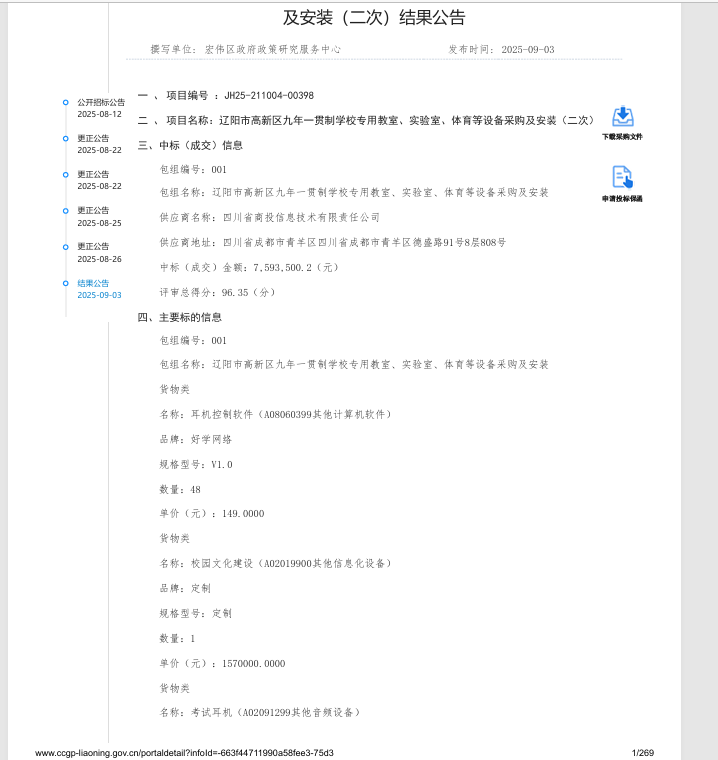 辽阳市高新区九年一贯制学校专用教室、实验室、体育等设备采购及安装