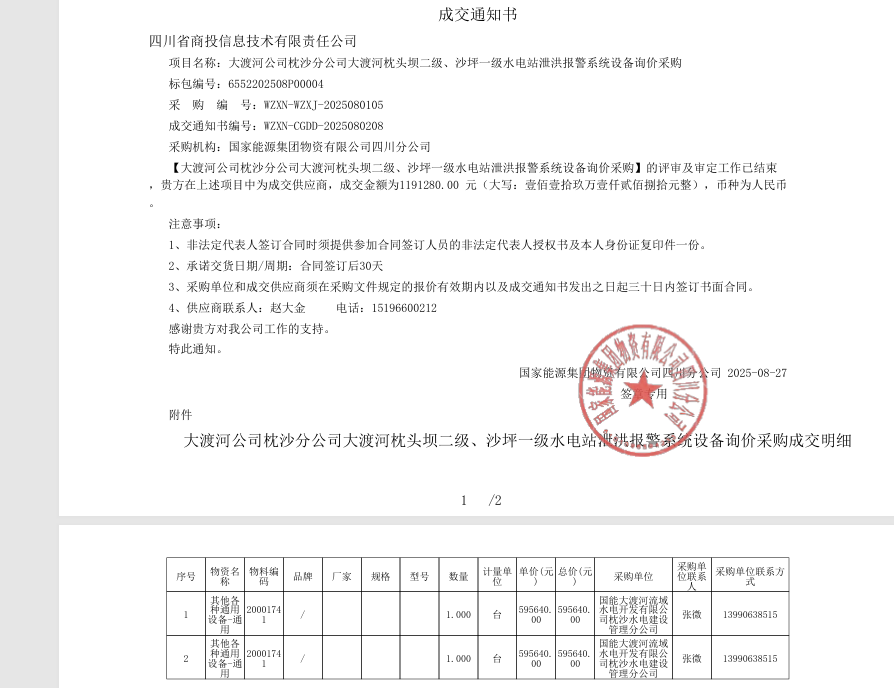 大渡河公司枕沙分公司枕头坝二级、沙坪一级水电站泄洪报警系统设备询价采购