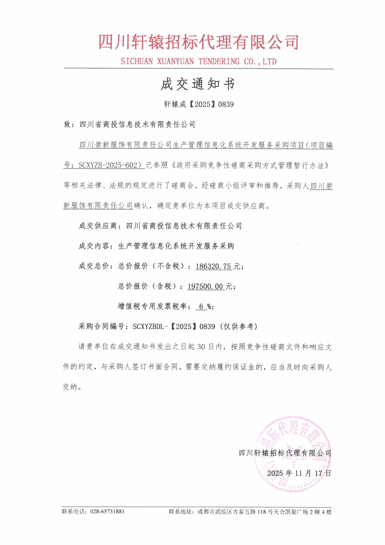 四川崇新服饰有限责任公司生产管理信息化系统开发服务采购项目